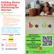 Join Neela Trivedi, LPC-Associate, for a free, empowering workshop focused on managing holiday stress through effective breathing techniques. The holiday season can bring excitement, but it often carries a heavy load of pressure, obligations, and emotional demands. This workshop is specifically designed for women to learn practical, immediate strategies to calm the nervous system and cultivate a greater sense of peace.